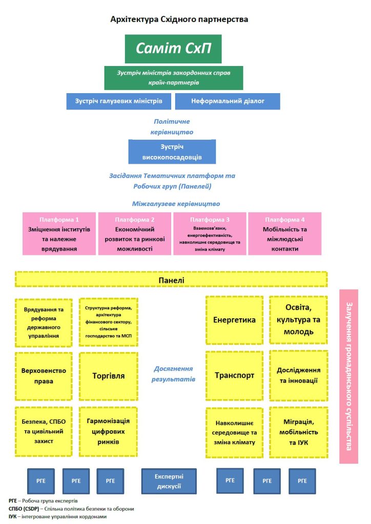 - Форум громадянського суспільства організовано для широкого залучення до роботи громадськості. Мета Форуму – розвиток контактів між неурядовими організаціями та сприяння їхньому діалогу з органами державної влади. Функціонує за принципом вищезгаданих тематичних платформ, отримує фінансову підтримку з боку Європейської Комісії. У кожній з країн-партнерів сформовано національні платформи Форуму. Українська національна платформа Форуму об’єднує понад 150 неурядових організацій України;